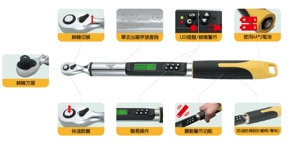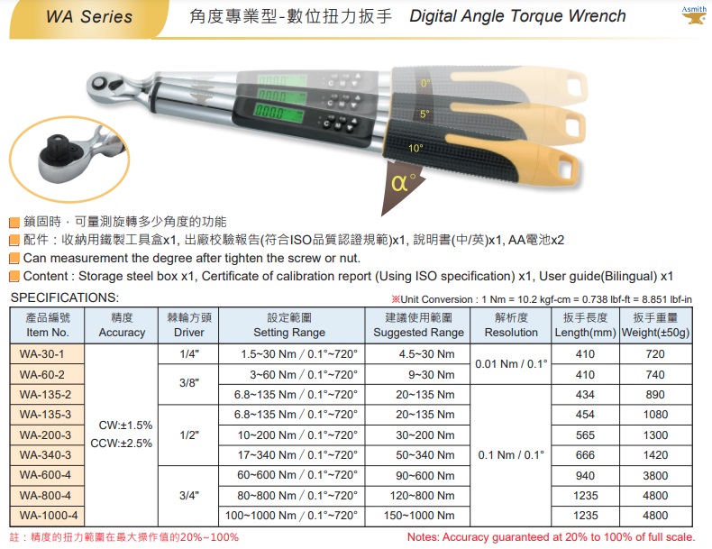 Various designs: HSIEH CHIEN AIR ACTIVATION CO., LTD. provides various designs of digital torque wrench WA series (4.5~1000 Nm / angle professional type)