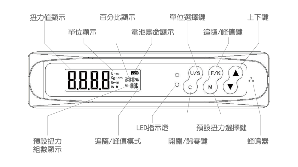 Digital Torque Wrench feature: - When locked, the function of measuring the angle of rotation - The angle function can easily measure the torque of the locked screw 1. Built-in pressure sensing chip, digital display of precise torque 2. Peak hold (K) and torque follow (F) modes 3. Buzzer and LED light warning (when reaching 80% of the preset torque value) 4. Vibration warning (when reaching 90% of the preset torque value) 5. Choose from four units: Nm, ft-lb, in-lb, kgf-cm 6. Automatic shutdown after 2 minutes of no operation 7. 30 groups of torque preset values 8. LCD backlight display ※※ Recommended accessories: sleeve※※ ➤Accessories: iron tool box x1 for storage, factory inspection report (conforming to ISO quality certification standards) x1, manual (Chinese/English) x1, AA battery x2